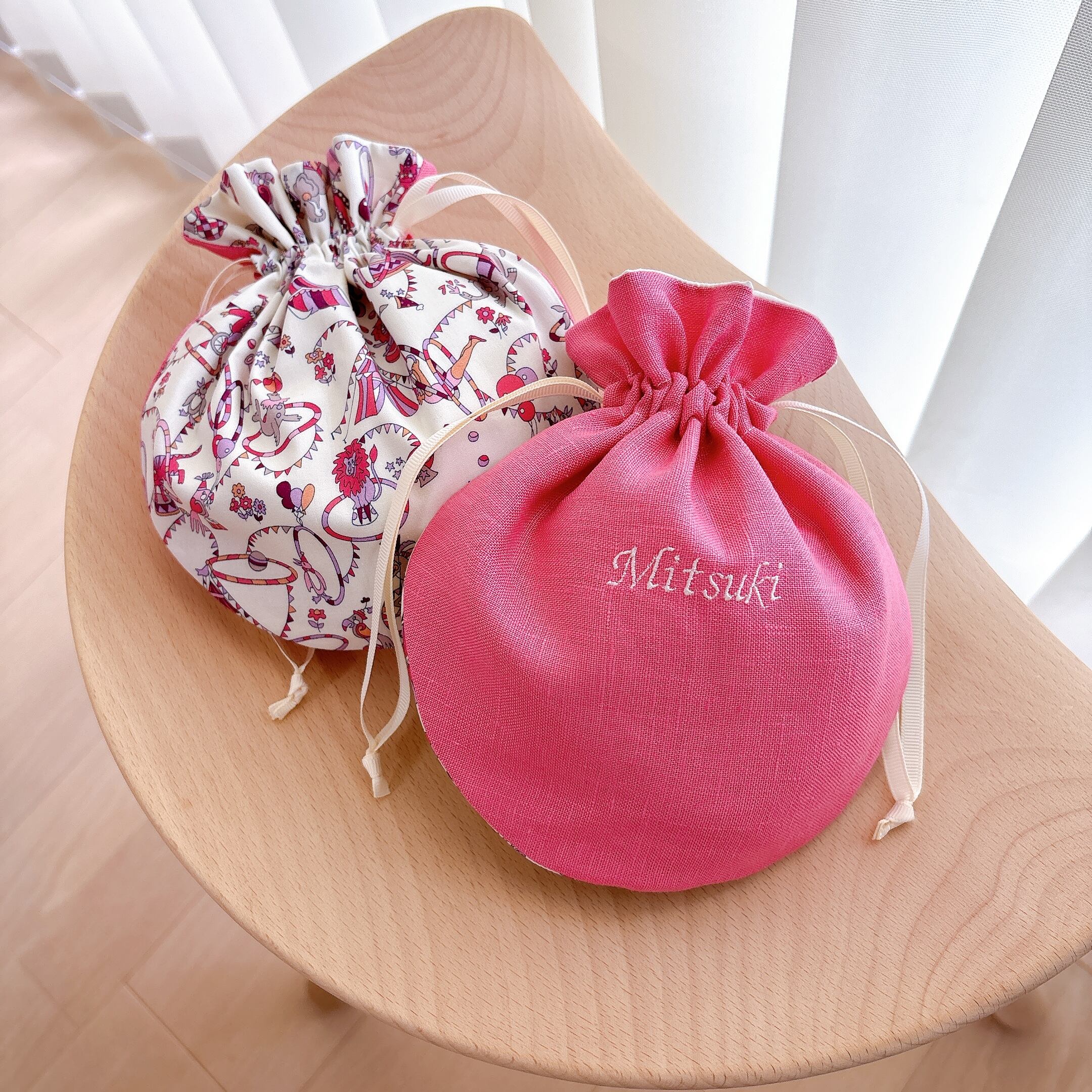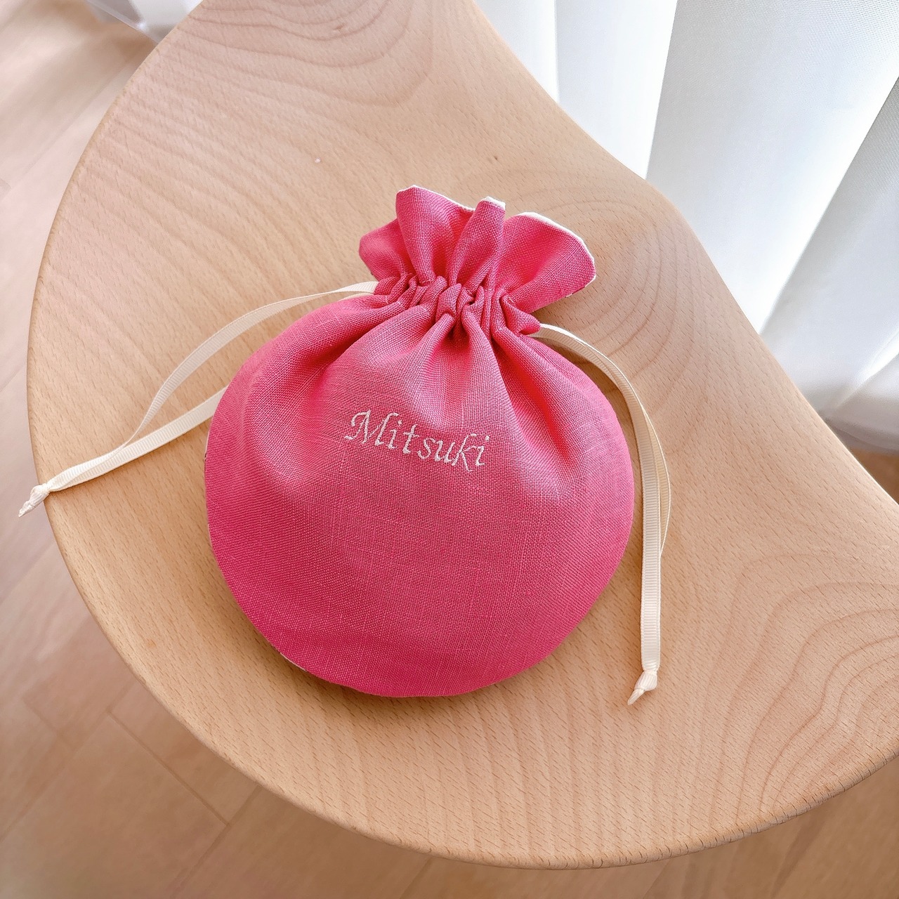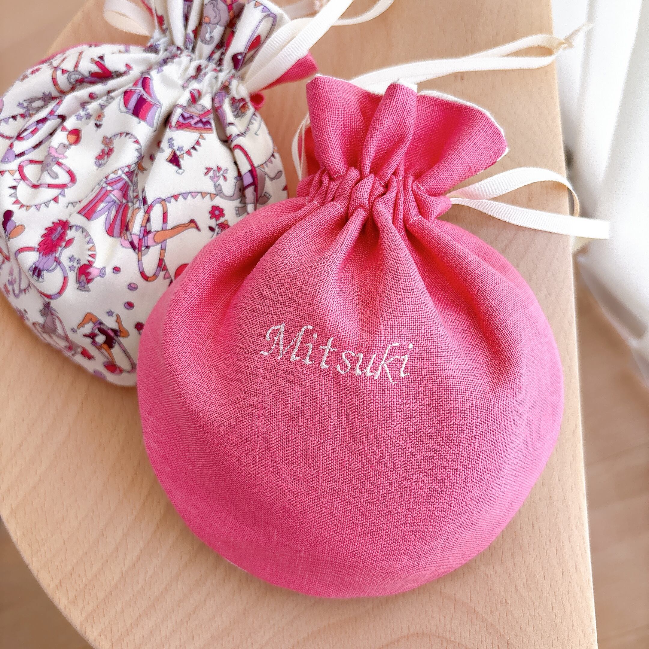 リネンの無地の生地にお名前など刺繍をすることも出来ます。(オプション)